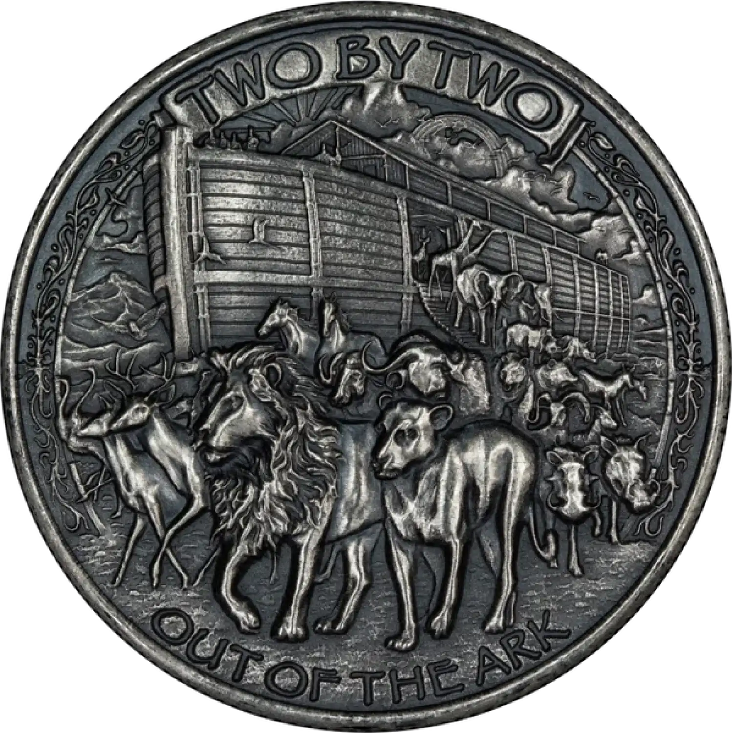 Adorned with an intricately detailed depiction of Noah's Ark, the reverse side of the round showcases the majestic vessel floating on the floodwaters, surrounded by the animals it carried. This beautiful design serves as a reminder of hope and renewal, making it a meaningful piece to own. The obverse features the weight, purity, and the issuing authority, providing assurance of its quality and authenticity. This combination of stunning artistry and precious metal ensures that the 1 oz Silver Round - Noah's Ark (Antique) will be cherished for generations.